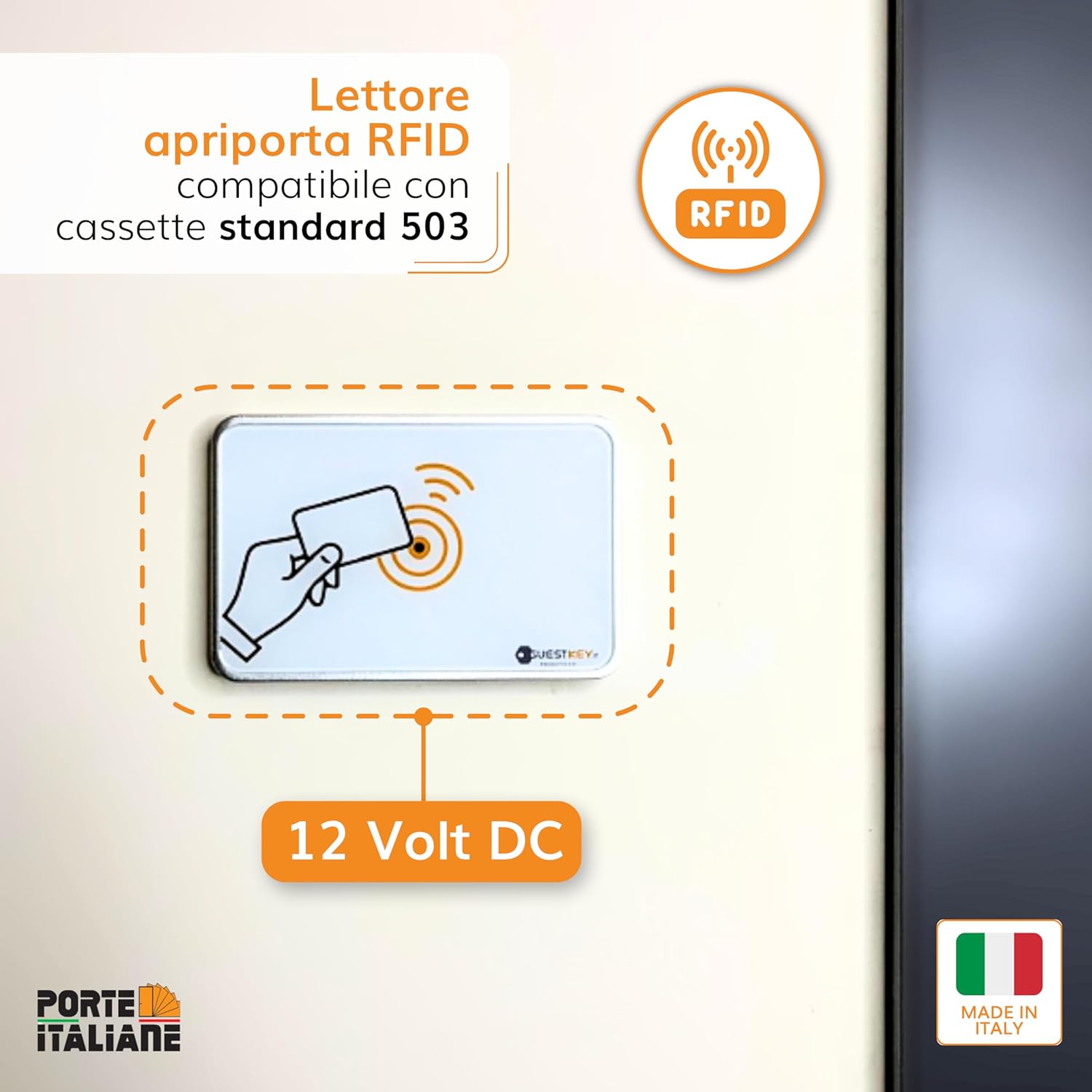 Il lettore badge per controllo accessi si adatta perfettamente nelle cassette elettriche 503. Viene applicata senza viti a vista. GuestCard รจ un dispositivo MADE IN ITALY.